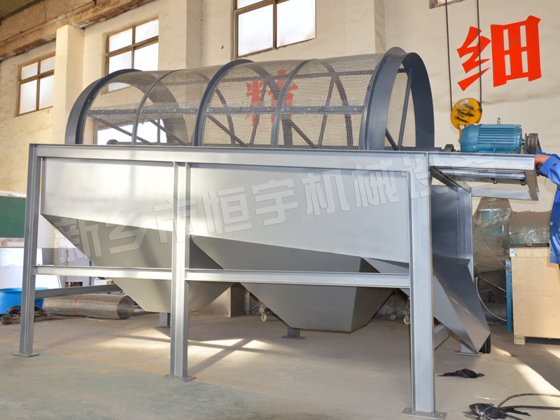滾筒篩是電動機通過減速器、聯(lián)軸器驅(qū)動傾斜安裝于機架上的滾筒繞其軸線轉(zhuǎn)動;當(dāng)物料進入滾筒后,由于滾筒的傾斜與轉(zhuǎn)動,篩面上的物料不斷翻轉(zhuǎn)與滾動的同時,自上而下通過分級篩網(wǎng)析出,由于篩網(wǎng)規(guī)格不同,物料逐漸被分離篩選,粒度合格的物料(篩下物)經(jīng)篩分后落入到各自的下料斗中,不合格的物料(篩上物)經(jīng)滾筒尾部的排料口排出;由于物料在滾筒內(nèi)的翻轉(zhuǎn)、滾動,使卡在篩孔中的物料可被彈出,防止了篩孔堵塞。